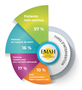 L’organisation de la répartition des interventions de l’équipe EMAH s’est structurée autour de plusieurs objectifs précis, garantissant une coordination efficace des soins. Tout d’abord, dans le but de réintégrer dans un parcours de soins les patients en rupture de suivi connus du CMP (Centre Médico-Psychologique), l’équipe a pris en charge 16 % des patients suivis sur l’EMAH. Pour diminuer le risque de rupture précoce en