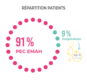 Par ailleurs, pour soutenir les équipes soignantes de la filière urgence-crise, notamment à travers les interventions post-consultation UAO et ZHCD (Zone d’Hospitalisation Courte Durée), l’équipe EMAH a assuré la prise en charge de 28 % des patients post-consultation UAO.